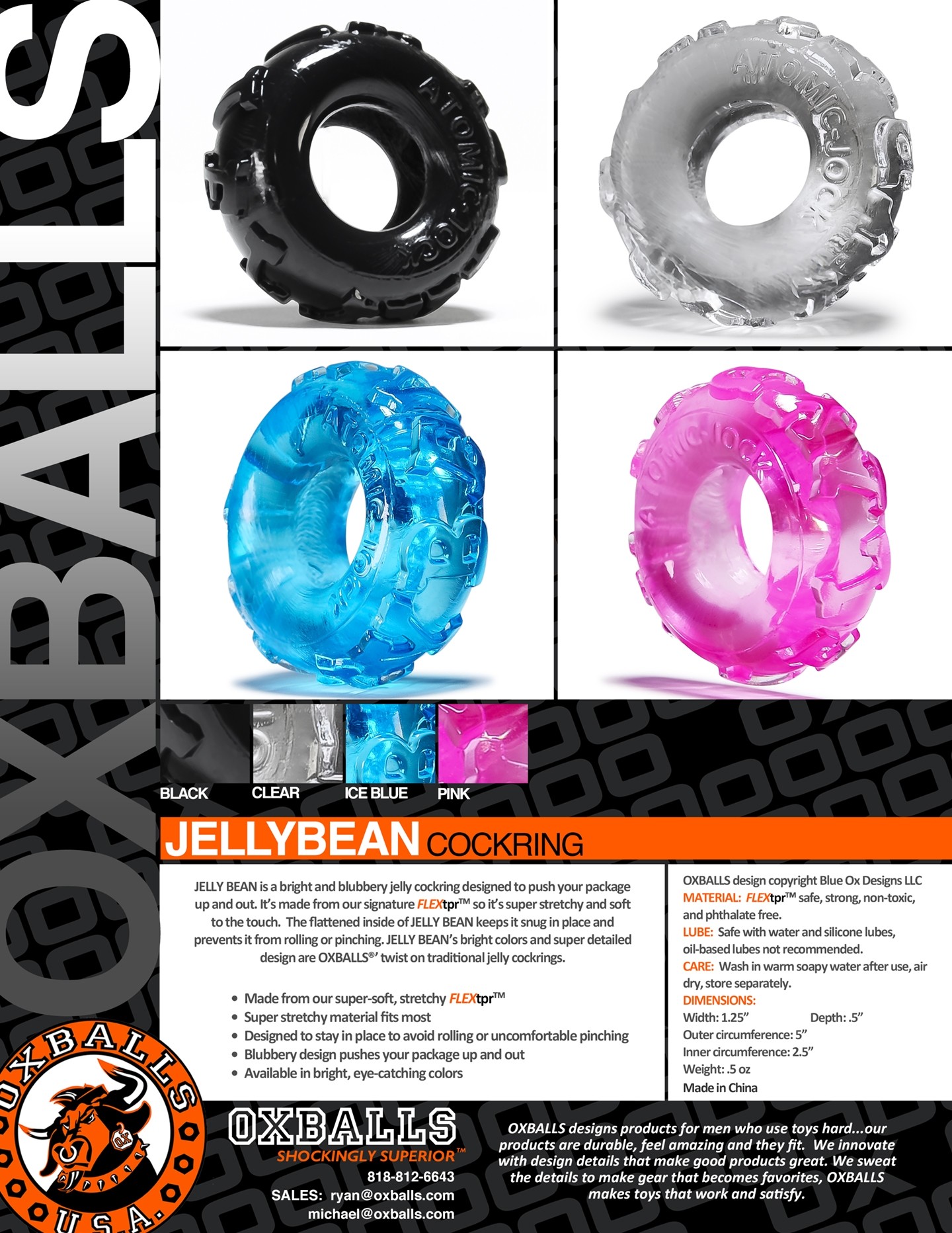 JELLY BEAN is a bright and blubbery jelly cockring designed to push your package up and out. It’s made from our signature FLEXtpr so it’s super stretchy and soft to the touch. The flattened inside of JELLY BEAN keeps it snug in place and prevents it from rolling or pinching. JELLY BEAN’s bright colors and super detailed design are OXBALLS’ twist on traditional jelly cockrings.