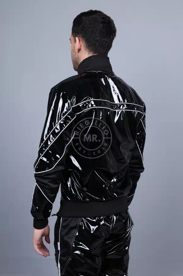 Shiny black MR. 24 PVC Tracksuit Jacket with front and back panel detailing.