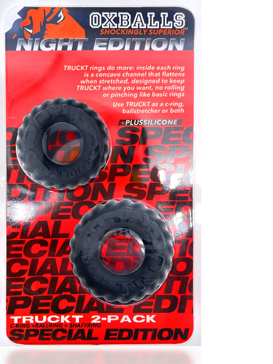 TRUCKT 2-pack cockrings in new NIGHT EDITION…velvety silicone finish PLUS+silicone™ blend, TPR for amazing stretch + silicone for a rubbery warm feel. NIGHT BLACK colour is a deep dull-finish black that feels warm and silky-smooth, less grippy, it glides on…more like vintage black rubber—it looks rich and deep and feels super slick.